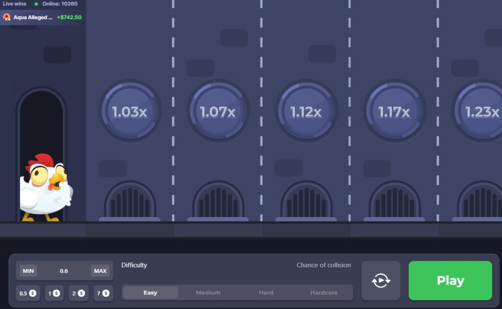 Zapomeňte na kotouče a karty. Tady je vaším hrdinou kuře. Ve hře, kterou v dubnu 2024 vydali malí géniové ze společnosti Inout Games, se stanete velitelem tohoto neohroženého ptáka. Cíl je jednoduchý: přejít cestu složenou z 2D čtverců. S každým "bezpečným" čtvercem se zvyšuje váš násobitel. Problém? Některé čtverce skrývají plameny. Pokud na něj vaše kuře položí tlapku, je to toast a váš podíl také!